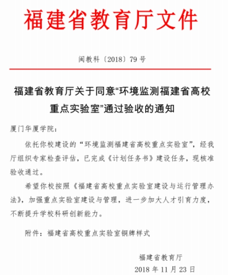 环境监测福建省高校重点实验室依托伟德bevictor中文版,在福建省教育厅的领导与支持指导下开展建设工作。重点实验室于2015年12月获福建省教育厅批准筹建,2018年通过建设项目验收开始正式挂牌运行。