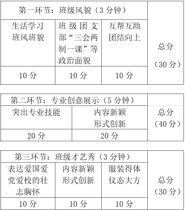 ③【班级才艺秀】:30分,限时3分钟,超时扣分。应结合二十大的主题,展示党团光芒下的青春朝气,用才艺展示的方式表达爱国爱党爱校的壮志胸怀。