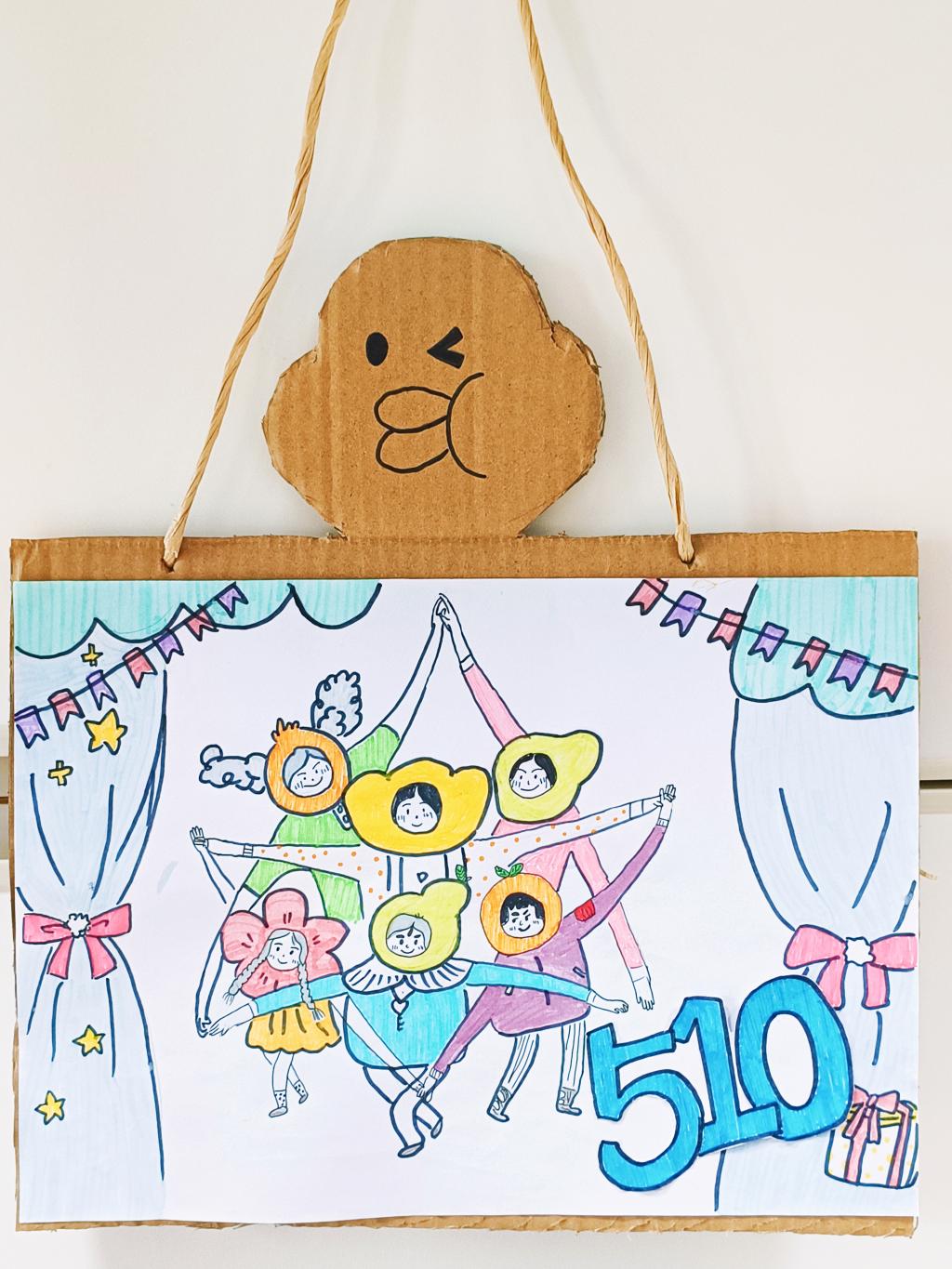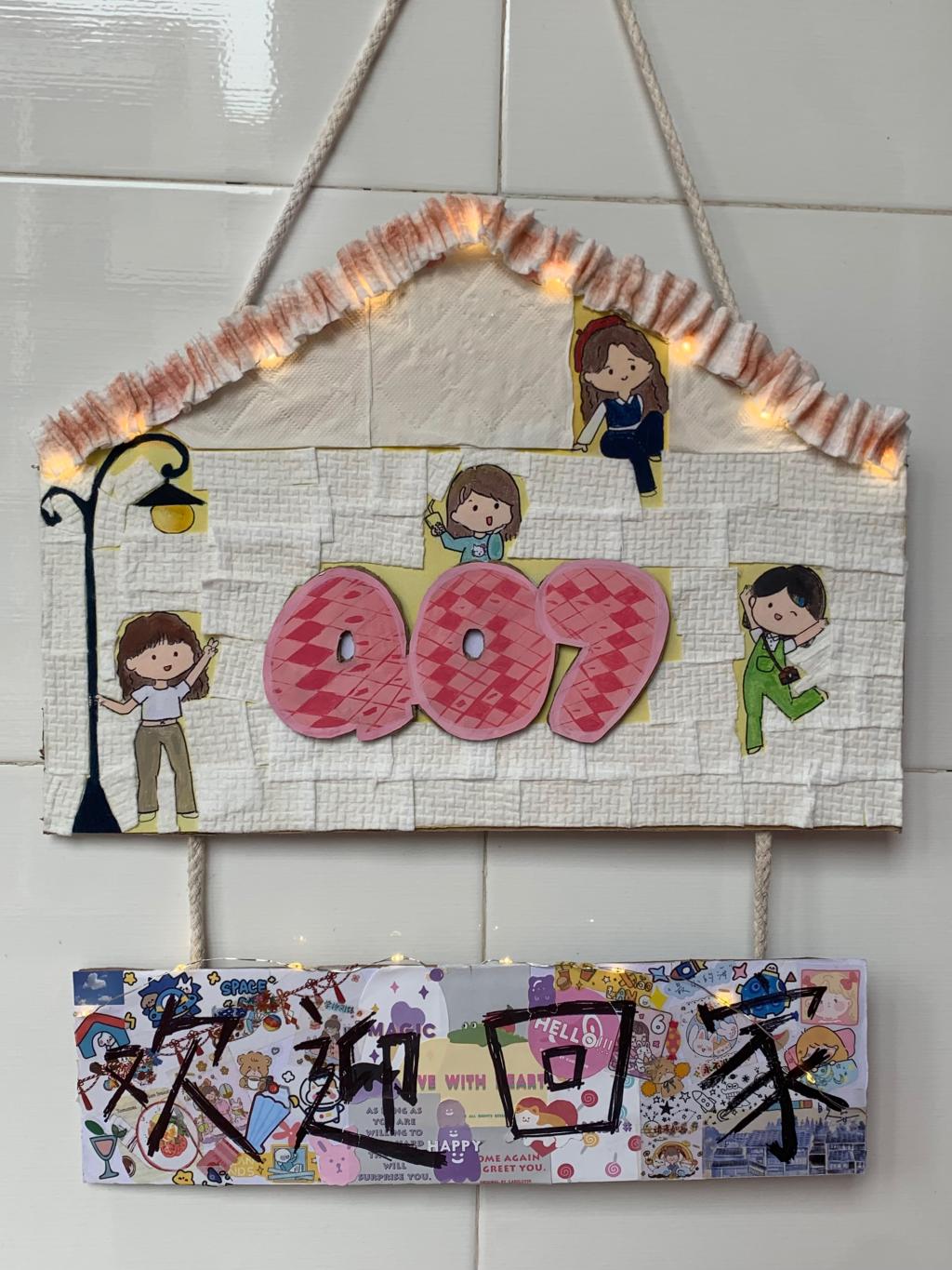 寓意:我们的作品整体是一个房子的外观,寓意着宿舍如同一个大家庭。作品里画的为宿舍的四个成员,下方的欢迎回家让求学在外、异地他乡的我们在宿舍有了如家一般的温暖和归属。制作的材料也一切以环保简约为主,回收利用了快递纸盒、洗脸巾和过期化妆品等为原材料,彰显了我们作为环境公司学子的环保意识。