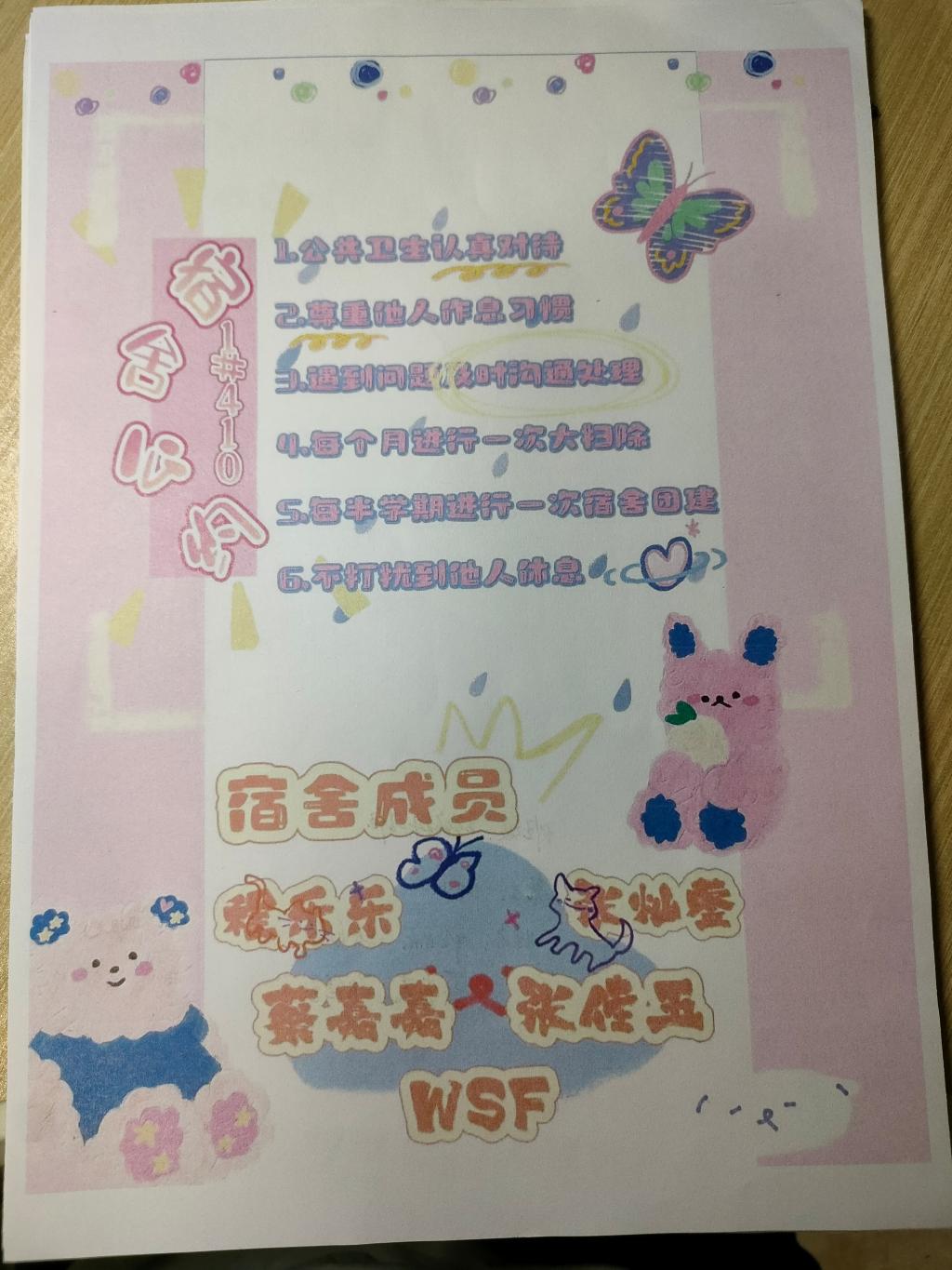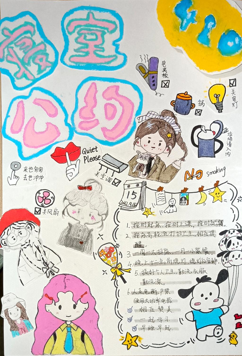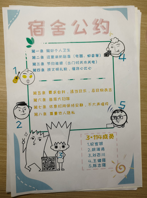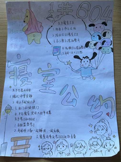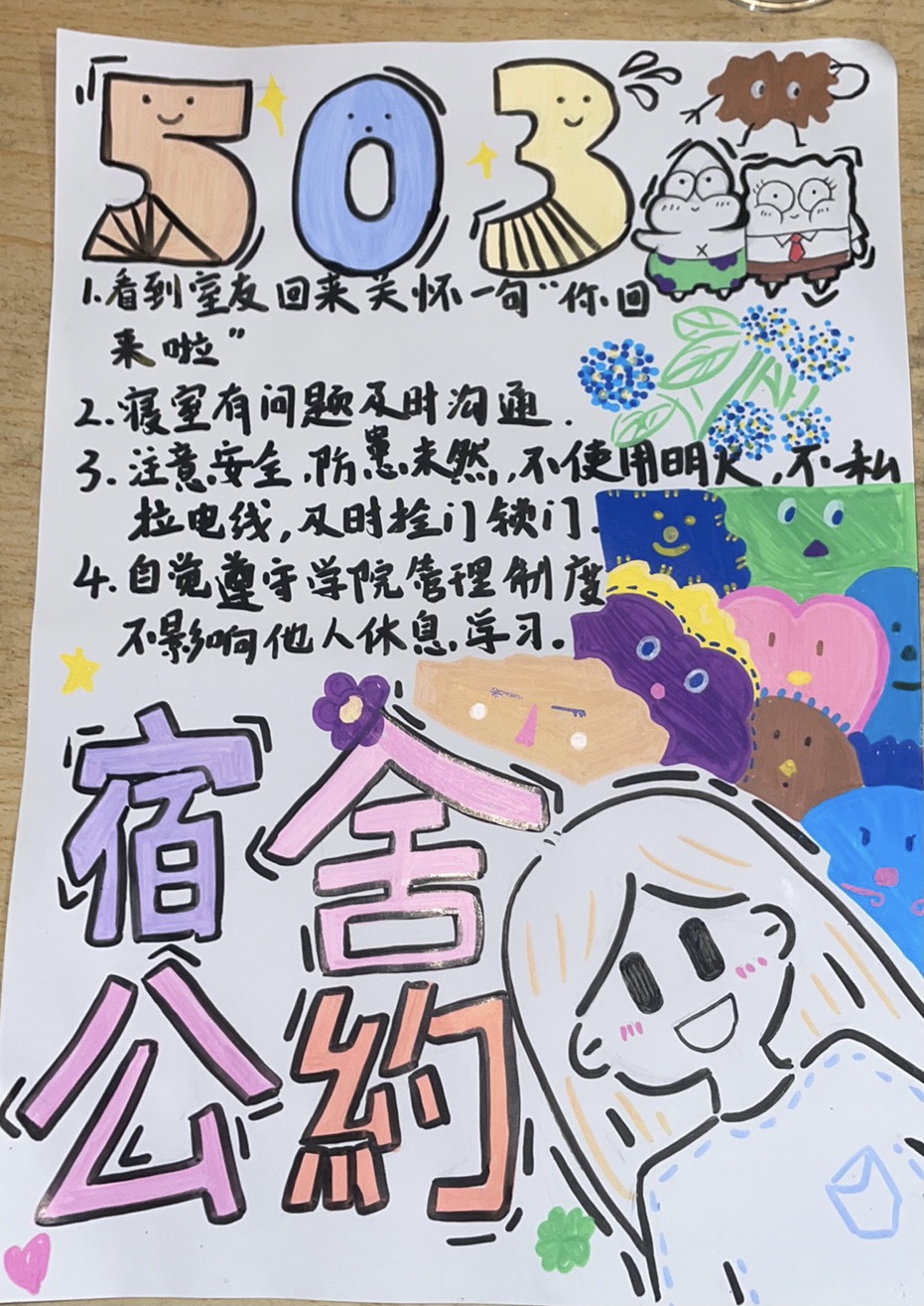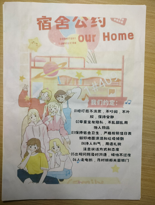 寓意:以彩色为底表示1#409的宿舍生活丰富多彩。公约上的卡通人物为我们的宿舍成员,表示我们成员之间相处融洽。公约上的每项准则为宿舍成员共同制定,我们学习上不仅要积极向上,生活上也要井井有条。