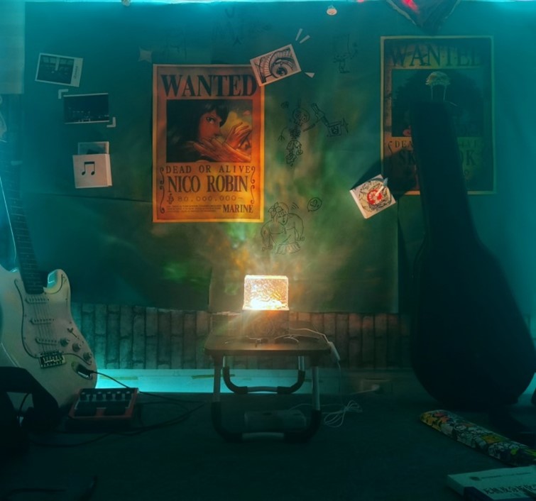 寓意:大学宿舍是大家在离开家后第一个拥有家的温馨的住所,里面的舍友来自不同地区、在不同的文化背景下长大,但在这里大家又拥有同样的欢愉和同样的伤心。一扇小门打开五张风格迥异的桌子,上面书法作品、钩织作品和绘画作品在不同的区域之间交织融汇,音乐又如一张桥梁架在五张桌子上将不同地区连接。她们同享欢笑又同面挫折,如同五朵不同的花朵在迎着朝阳一同绽放。