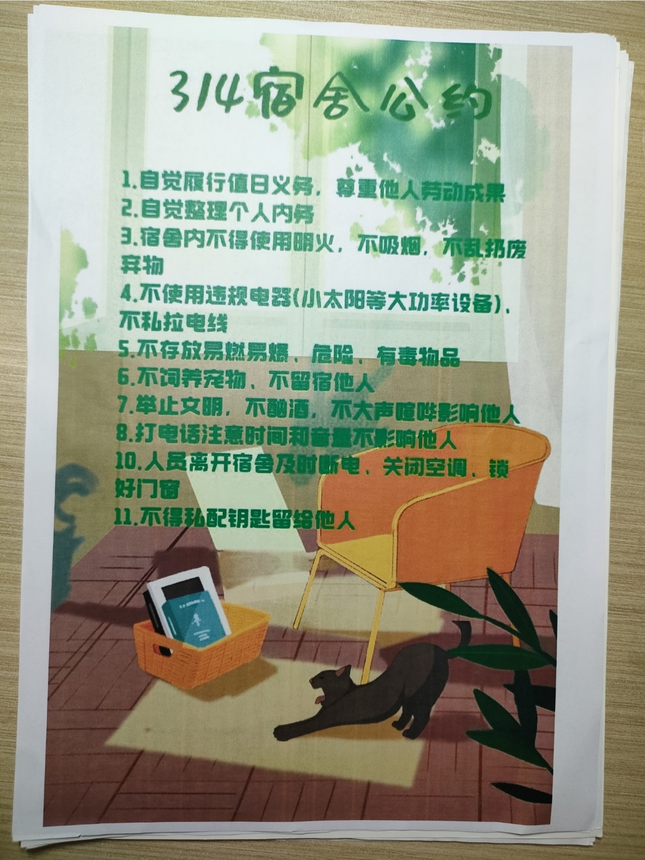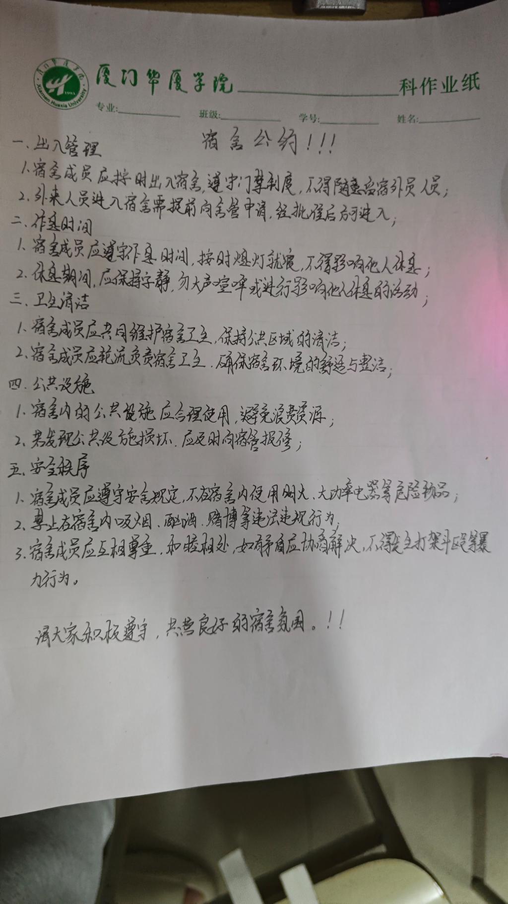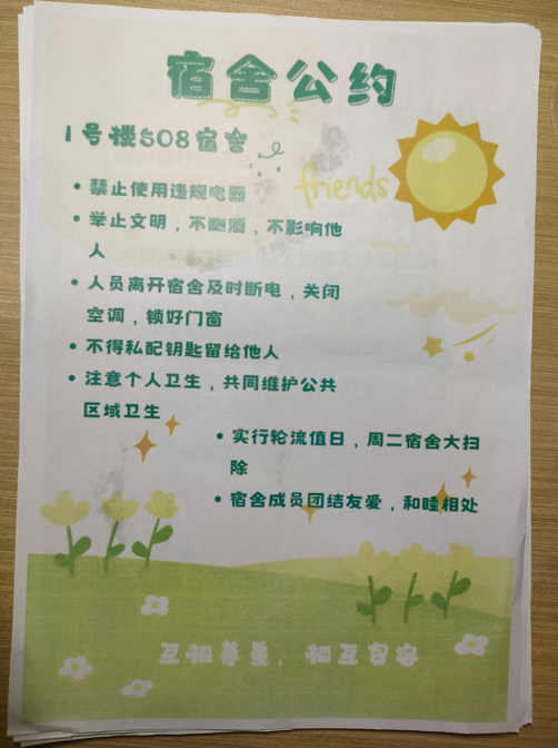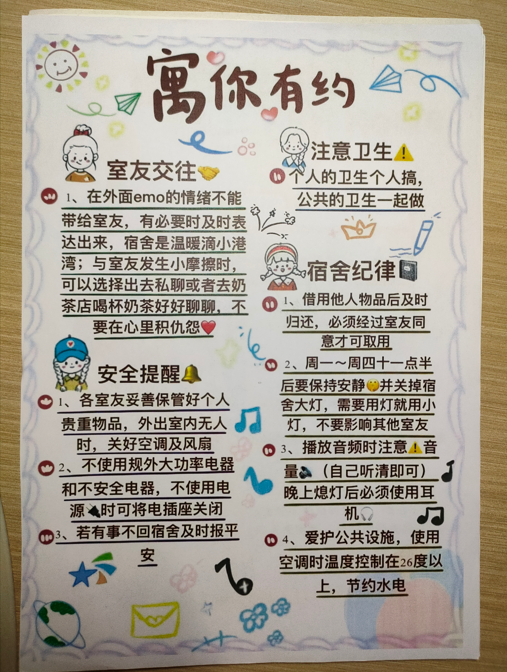 寓意:首先,它有利于规范宿舍成员的行为,维护宿舍秩序,营造一个温馨、和谐的生活环境。同时,它还能培养我们的团队协作精神,增强宿舍的凝聚力。所以,制定一份宿舍公约非常有必要, 我们一定要好好遵守它,共同营造一个温馨的宿舍氛围。