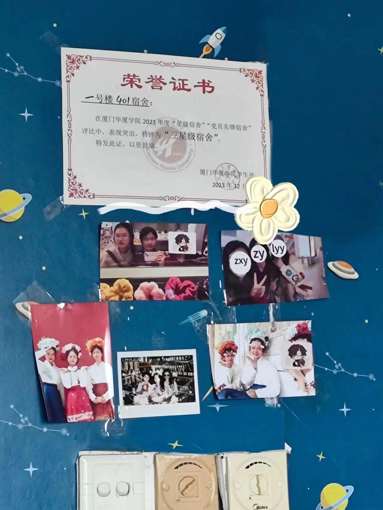 寓意:宿舍是我们每个人的能量站,我们总能在宿舍中汲取到能量并充沛我们的精力。这能量站还是我们的回忆录,里面记录着我们所有的美好回忆。在平时我们就很喜欢记录宿舍一点一滴,每一个让我们记忆深刻、意义非凡、甚至是普通平常的瞬间,都会是未来我们的美好回忆。当然一个宿舍的整洁不仅仅体现在收拾得整齐干净,还应该有爱有温暖,所以我们宿舍很多小角落,就有我们各自独有的氛围感!这些小小的氛围感让我们感觉一回到宿舍,就有了回家的感觉,就有了身心的归属感。今天,我们用镜头定格了这一刻,留住了这份温暖。明天,我们将继续向前迈进,共同绘就更多美好的画卷。
