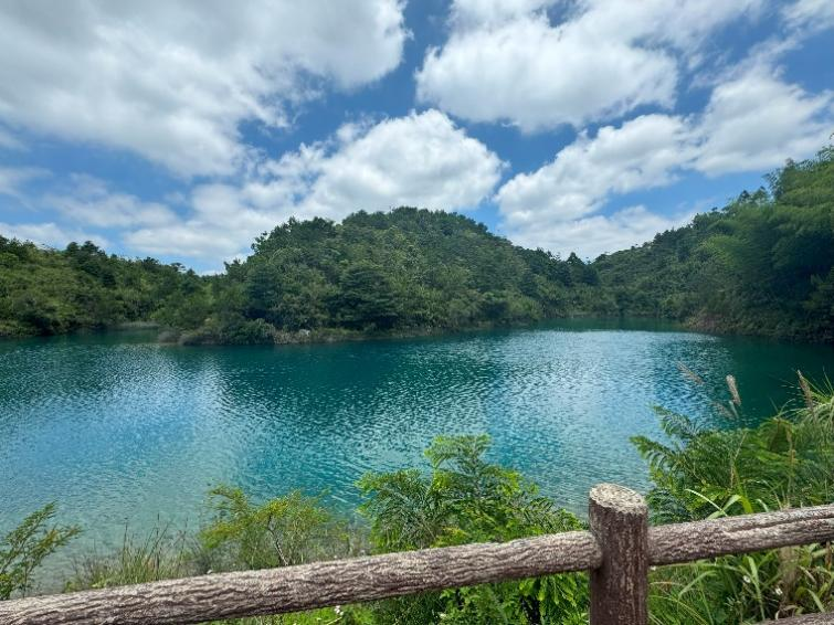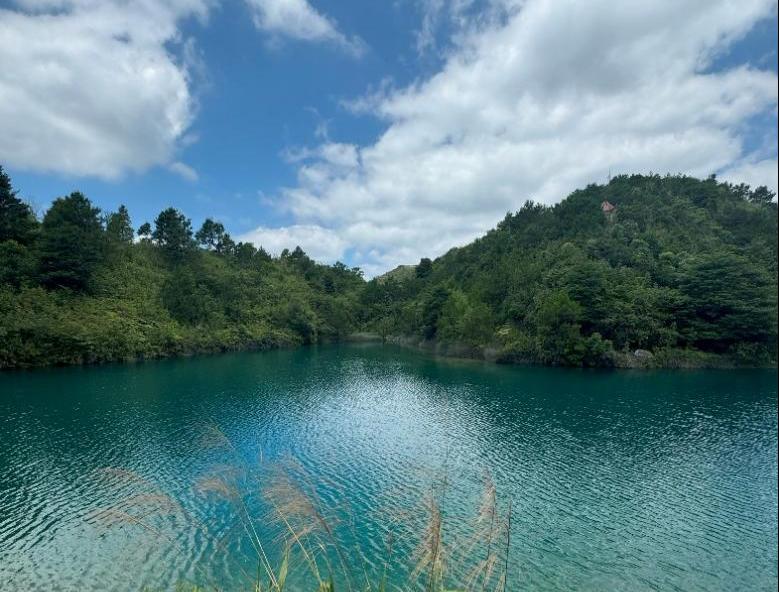 实践队队员们随后实地走访生态地标七彩池。七彩池依托当地山水资源,通过系统性生态保护与景观提升,实现从普通山塘蜕变为“碧波映青山”的乡村生态名片。实践队队员观察到七彩池池水因水深与光照差异呈现青碧、靛蓝等渐变色彩,池畔旁植被覆盖率极高,形成“山水相依、绿植环绕”的自然景观。如今的七彩池已成为村民休闲与生态研学的双重载体,直观展现“绿水青山就是金山银山”的发展实践。