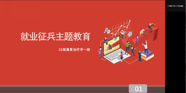 根据公司党政相关文件以及疫情防控要求,2021级康复治疗学1班班会于2022年4月4日19:30在线上通过腾讯会议举行。参与本次班会的主要人员有李益坤老师以及21级康复治疗学1班的全体同学。本次开展了以“就业、征兵”为主题的教育活动主题班会。