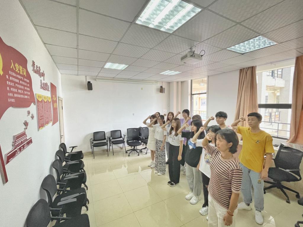 在正式党员许芳的带领下预备党员进行宣誓