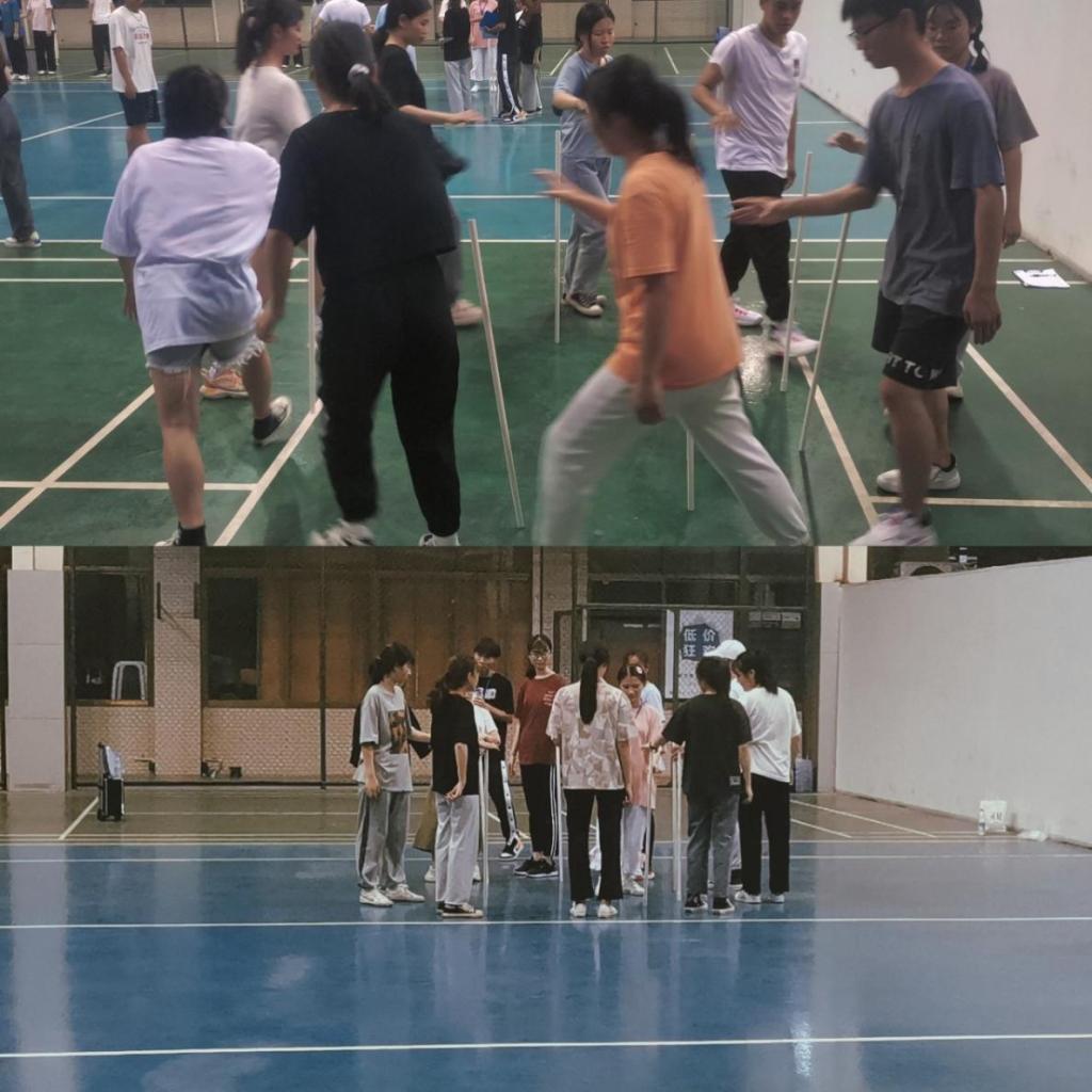 活动首先进行的是“传球接力”和“链接加速”项目。“传球接力”是由第一位成员开始,脖子夹着一颗网球并传递给第二个成员后迅速跑到队列的最后等候,以此方式进行传递直到整组通过终点。“链接加速”是全队一字纵队排开,后一位同学抓住前一位的左脚,并用另一只手搭在前一位的右肩全队用单脚跳的方式跳过指定距离。这两个项目旨在增加团队成员之间的交流,建立彼此之间的信任。
