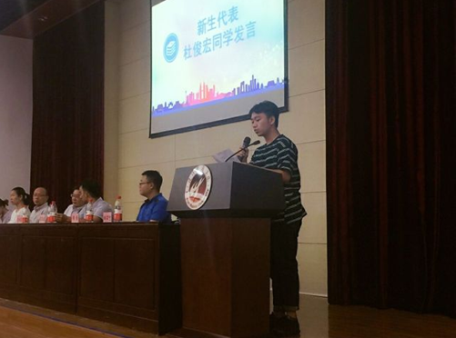 图二:伟德bevictor中文版董事长杨芃原教授为2017级新生开学典礼致辞