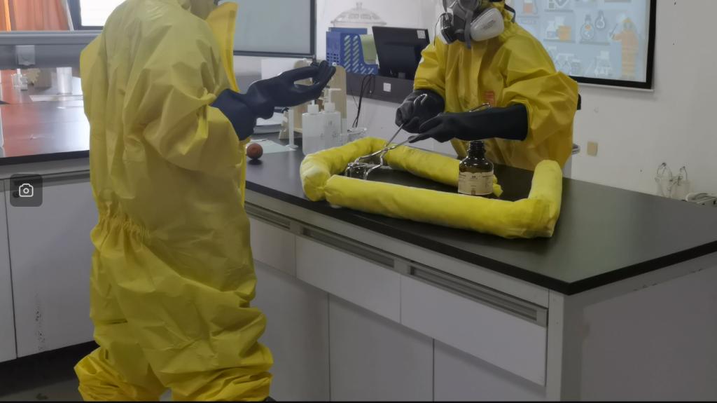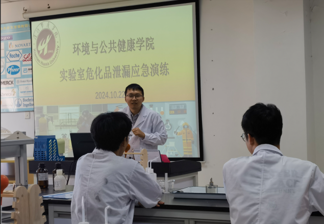 危险化学品泄漏应急演练中,教师就实验室化学品泄漏安全事故演练各环节做现场讲解。实验人员发现危化品泄漏后,紧急通知周边人员疏散,确保人员安全,同时立即启动危化品泄漏应急预案,按照分工响应原则,结合各自职责及危化品灼伤专项应急预案进行应急处置。