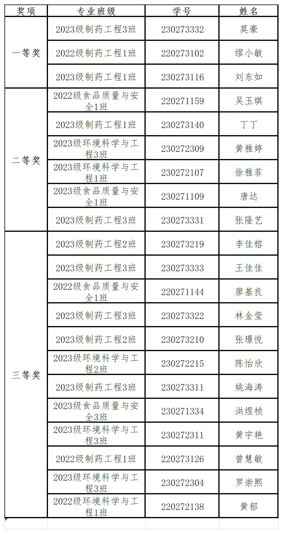 附1:第五届理化分析实验技能竞赛获奖情况表