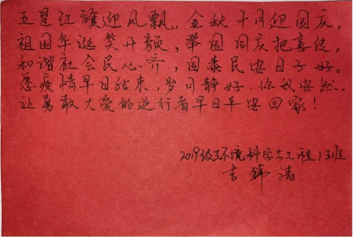 谁无暴风劲雨时,守得云开见月明!当前厦门市疫情防控工作虽取得阶段性成效,但我们不能麻痹大意,严格遵守厦门市防控要求。在这金桂飘香的季节里,党团先锋队队员们随着心意一笔一划写下的祝福语,让这个本就特殊的国庆佳节更有意义!更是增加了大家战胜“疫情”的信心,让我们怀揣着对祖国母亲真切的祝愿一起期待更加美好的未来吧!