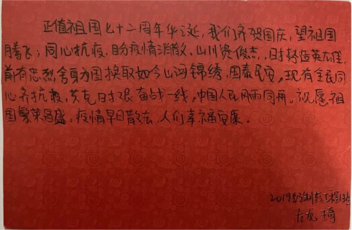 2021年9月30日,公司党团先锋队开展了“喜迎国庆 不忘抗疫”手写祝福语活动,千秋华夏,壮丽河山,落日余晖,璀璨星河,祝伟大的祖国母亲生日快乐!愿我们伟大的祖国永远繁荣昌盛,国泰民安!同时也感谢为疫情防控付出的校园英雄们,你们用爱和行动践行“请党放心,强国有我”的铮铮誓言,让这个特殊的国庆节尽是欣慰、满是感动。