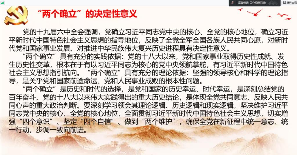 在本次宣讲会上,张羽凌同学从“两个确立”及决定性意义、“两个确立”在二十大精神中的引领地位、“两个维护”等三方面来宣讲。她解释了“两个确立”和“两个维护”的含义,系统性地阐述了“两个确立”的决定性意义,再从政治、历史、实践三个角度解读了“两个确立”在二十大精神中的引领地位,最后讲述了如何坚决做到“两个维护”。整场宣讲主题明确、内容详细、结构清晰,对先锋队队员学习党的二十大精神有很大的帮助,也加深了队员们对“两个确立”和“两个维护”的理解。