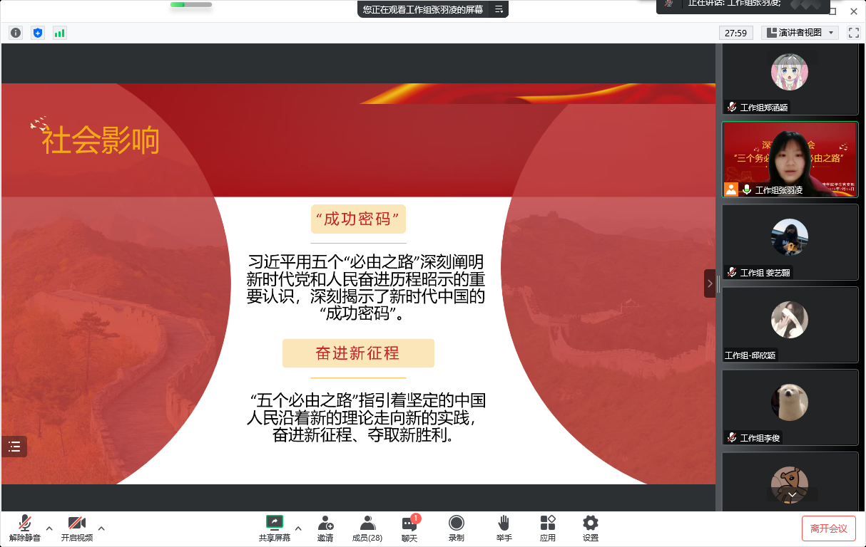 通过本次线上集中学习,大家深刻体会了“三个务必”政治要求和“五个必由之路”规律性认识,是我们党在历经艰辛、饱经风雨的长期摸索中积累形成的,饱含着成败和得失,凝结着鲜血和汗水,充满着智慧和勇毅,是必须传承好、发扬好的宝贵财富。尤其在新征程上,我国发展进入战略机遇和风险挑战并存、不确定难预料因素增多的时期,各种“黑天鹅”“灰犀牛”事件随时可能发生。作为新时代青年,我们更加紧密地团结在以习近平同志为核心的党中央周围,全面贯彻习近平新时代中国特色社会主义思想,深刻领悟“三个务必”政治要求,始终坚持“五个必由之路”,踔厉奋发、勇毅前行、团结奋斗,不断谱写新时代中国特色社会主义新篇章,奋力实现中华民族伟大复兴的中国梦!