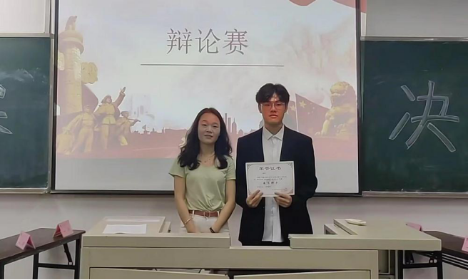 辅导员张小玲老师为“优秀辩手”陈瀚同学颁奖