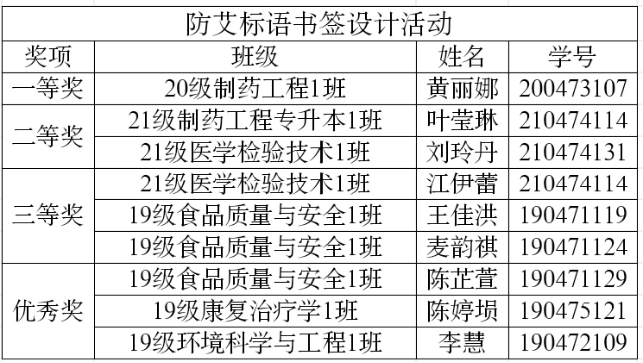 防艾标语书签设计活动黄丽娜同学获得一等奖