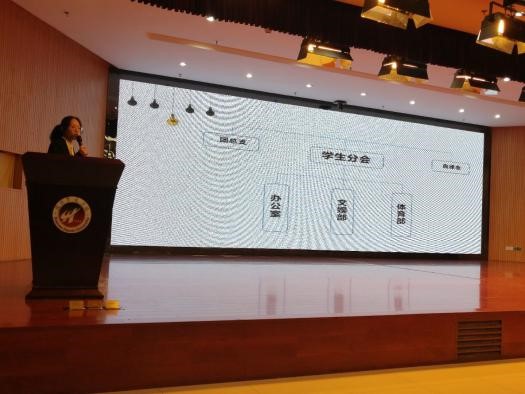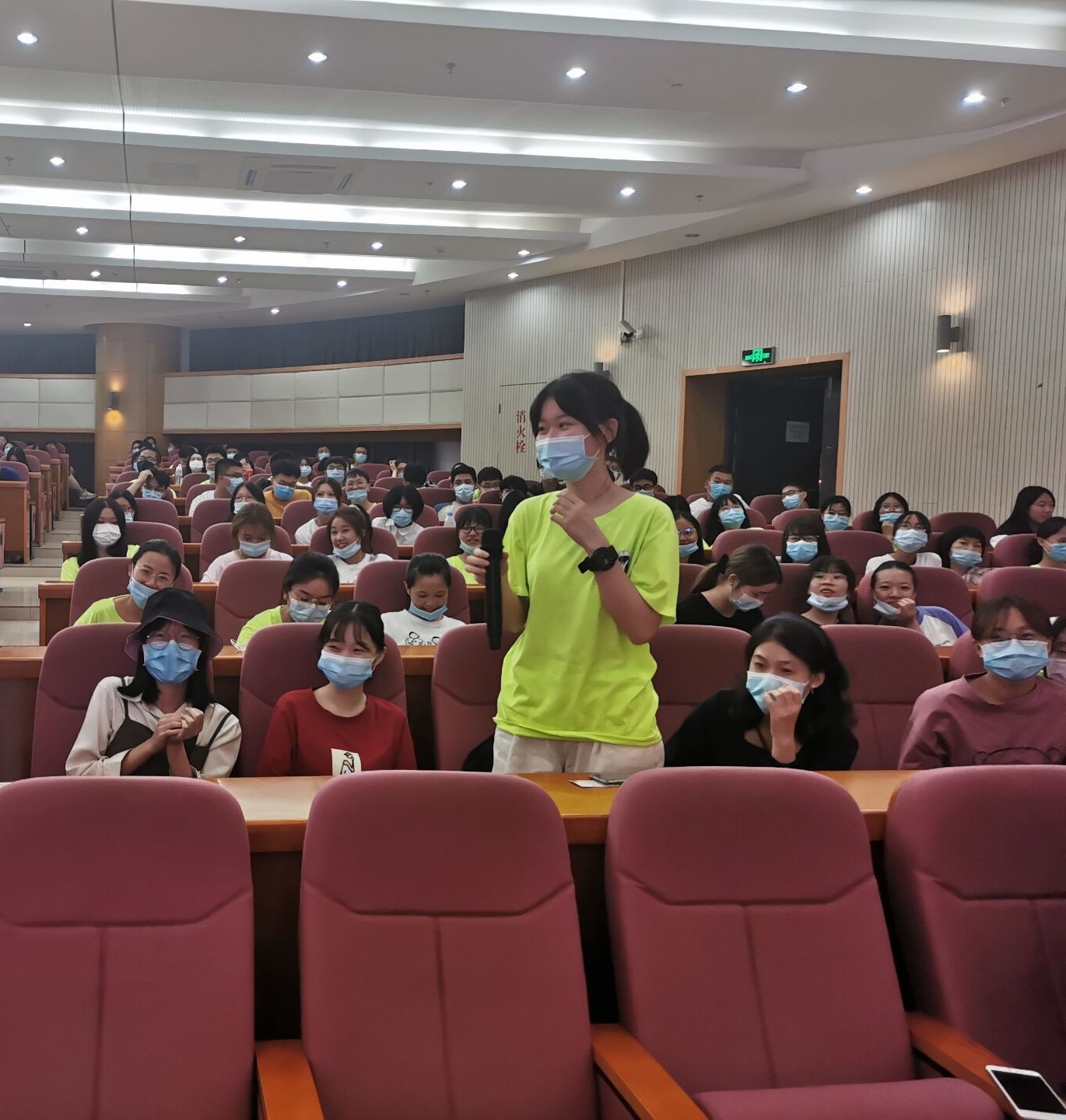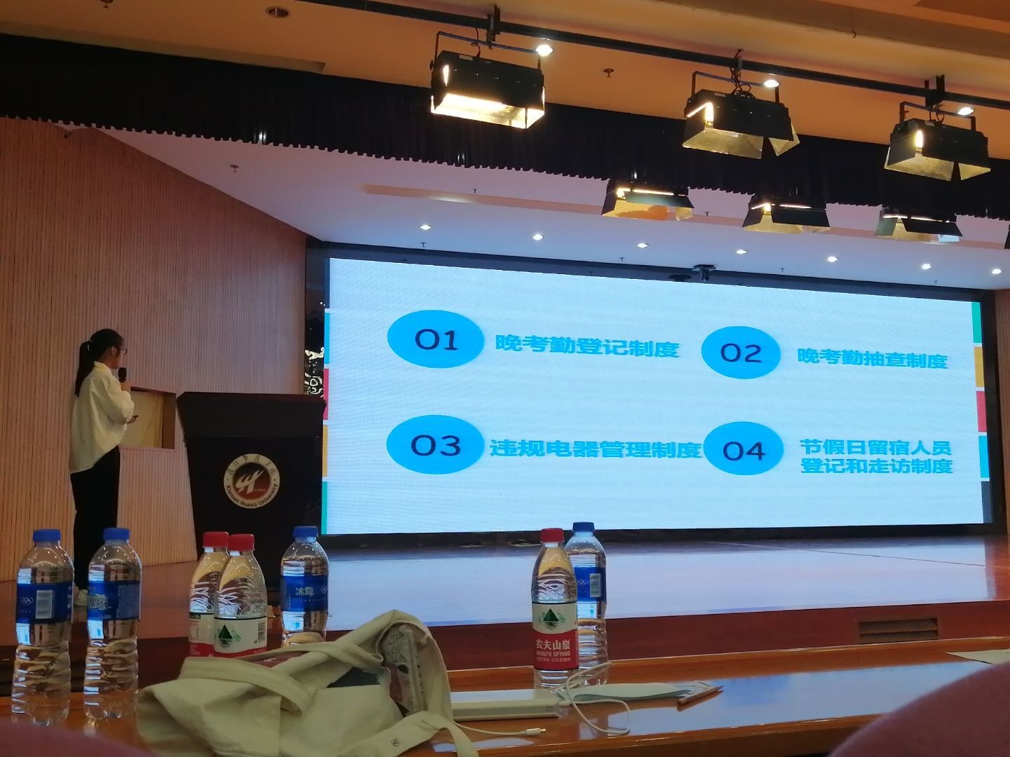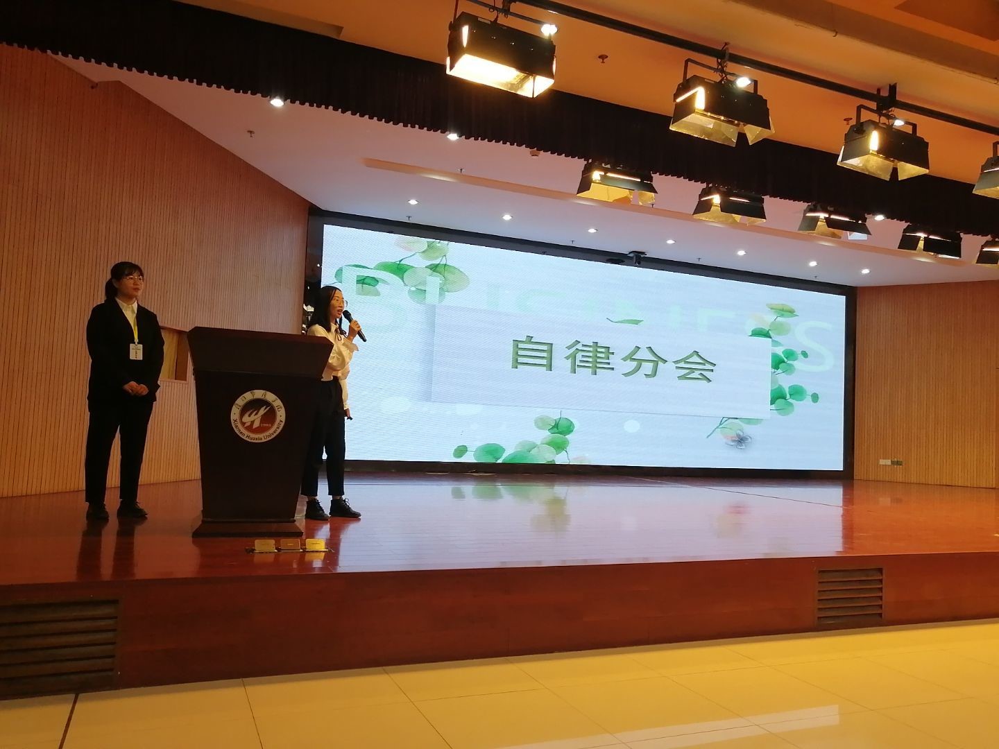 在两位老师发言结束后,新老生交流会正式开始。新老生交流会分为四个部分,第一环节是自律分会干部讲解卫生管理制度跟晚考勤制度,让新生们能够更顺利的适应宿舍生活,还介绍了爱心小组和宿舍急救知识普及,让新生们在遇到紧急情况时有一定的应急措施。