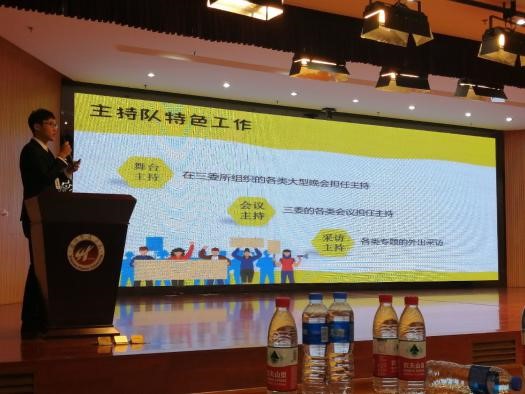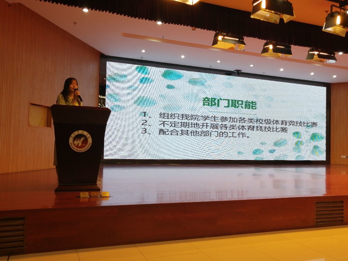 第三环节为部门纳新。先由团总支员工兼职副书记丁黄滢学姐和团总支委员会办公室主任林美婷学姐各自上台发言,再由各部门负责人依次上台为新生们介绍各自部门的工作和活动,并邀请新生们加入各部门的咨询群,让新生们更了解各部门。