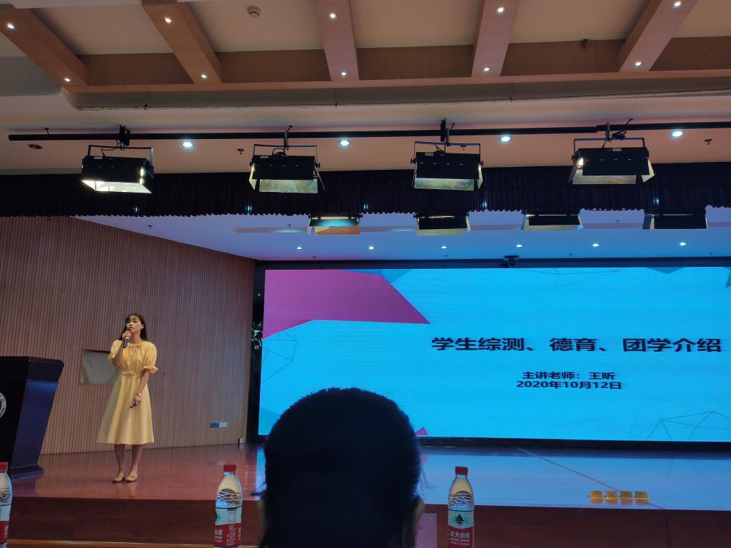 首先由王昕老师上台为同学们讲解员工综测、德育、团学介绍,帮助新生了解在大学中的一些常识。然后由李益坤老师向新生传达老员工安全教育,提醒新生们要注意防火、防盗、防骗,保护自己的人财安全。