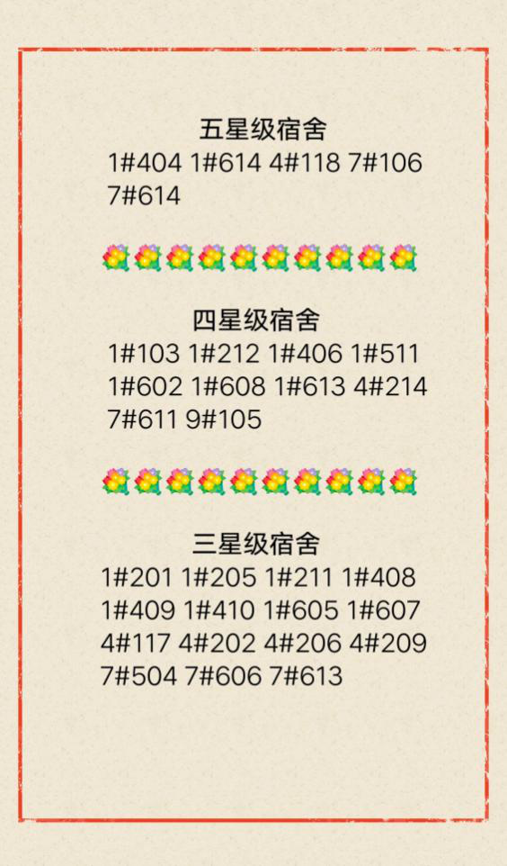 本次评选共有72间宿舍参加,在所有参评宿舍的支持下,2019-2020学年星级文明宿舍评选正式落下帷幕,星级文明宿舍公示名单如下: