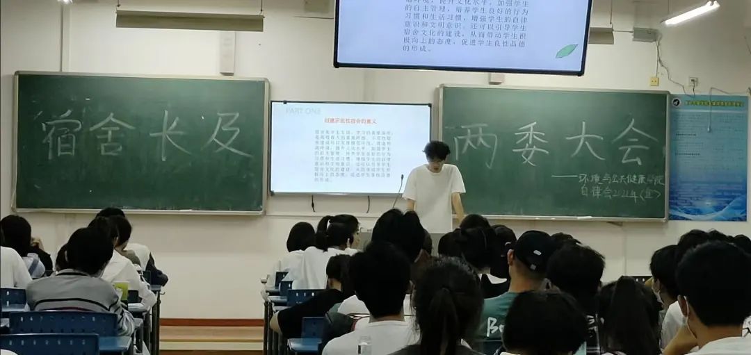 会议第四项流程是——生活部部长郑佳婷讲解宿舍卫生内务标准,副部长何桐旭讲解创建示范性宿舍的意义和要求。用一张张形象具体的照片讲述宿舍五要、五不要,表达了对营造良好整洁宿舍环境的美好期望。