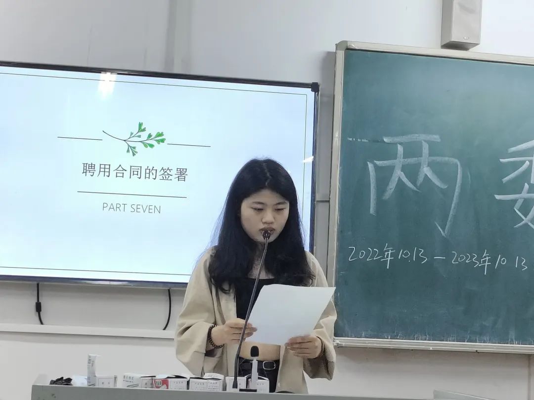 会议第六项流程是——自律会执行主席朱佳玲组织宿舍长和两委签署聘用合同,并对合同签署的注意事项进行详细的解说与介绍。
