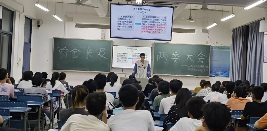 会议第三项流程是——纪检部部长张羽凌讲解晚考勤制度,副部长陈勇讲解违规电器检查制度和节假日留校人员名单统计与走访相关注意事项。强调宿舍长责任的重要性,并提醒同学们安全使用电器的必要性,为同学们的宿舍安全保驾护航。