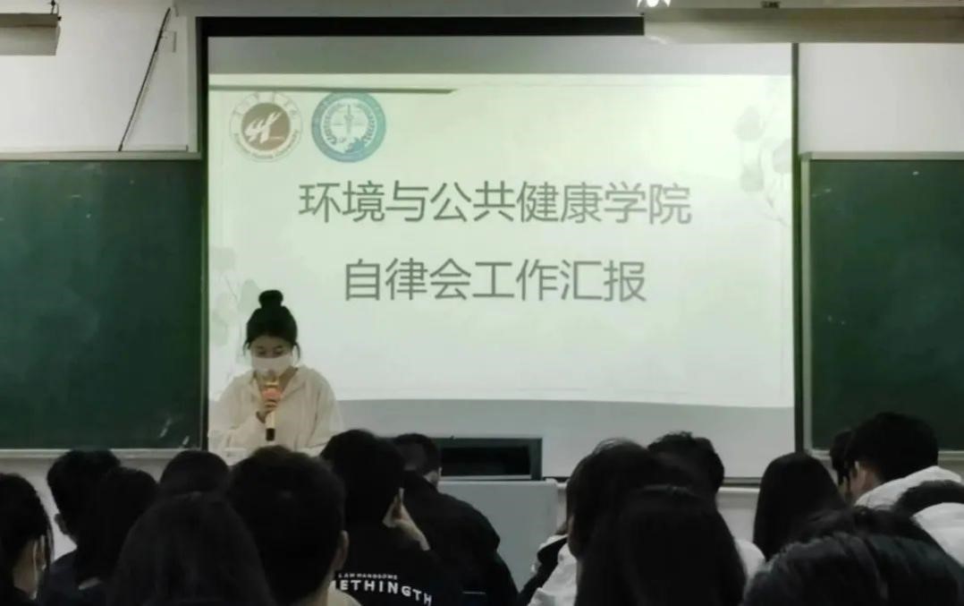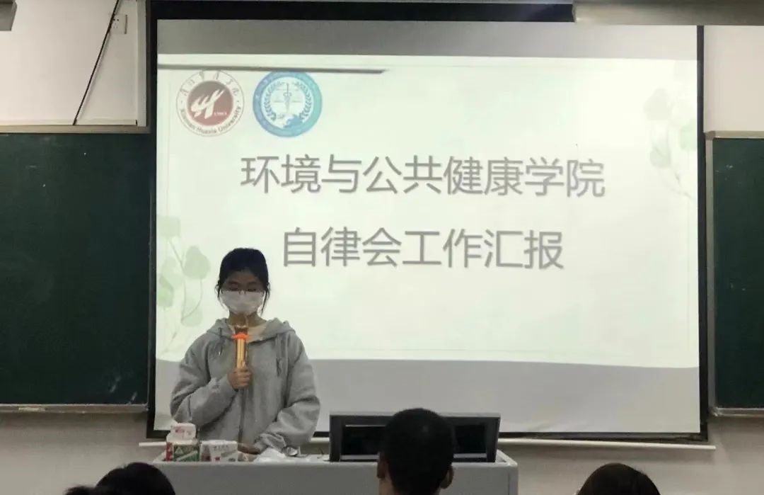例会的第四项议程是由自律会各部门展开工作总结,首先由自律会执行主席朱佳玲同学上台介绍自律会各部门,汇报顺序依次为自律会秘书部、生活部、纪检部。
