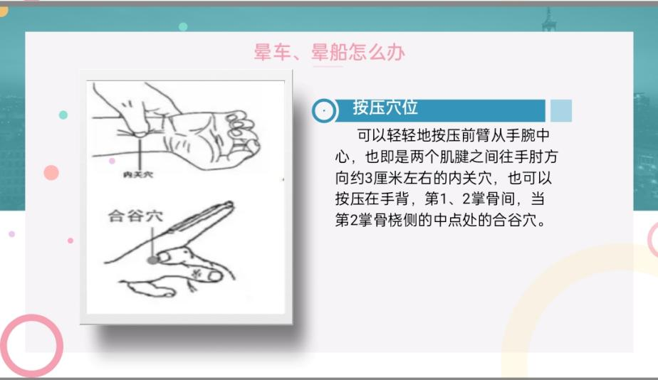 晕车是生活中较为常见的突发状况,预防晕车的有效方法有:上车前半小时服用晕车药、口含话梅或姜片糖,上车时选择前排靠窗就坐或按压内关穴和合谷穴。