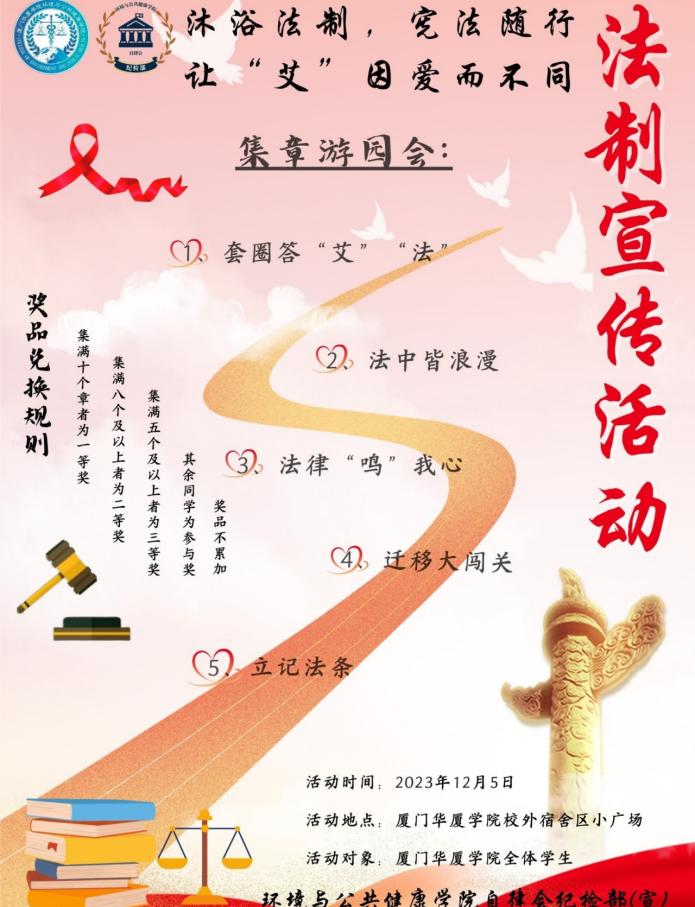 每年12月1日和12月4日是世界艾滋病日和“国家宪法日”,今年是第36个“世界艾滋病日”和我国第十个“国家宪法日”,为贯彻落实党的二十大精神,结合“凝聚社会力量,合力共抗艾滋”以及“大力弘扬宪法精神,建设社会主义法制文化”的主题,bevictor伟德自律会纪检部特举办法制宣传暨防艾科普集章游园会。