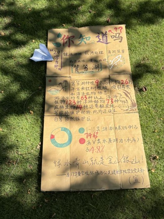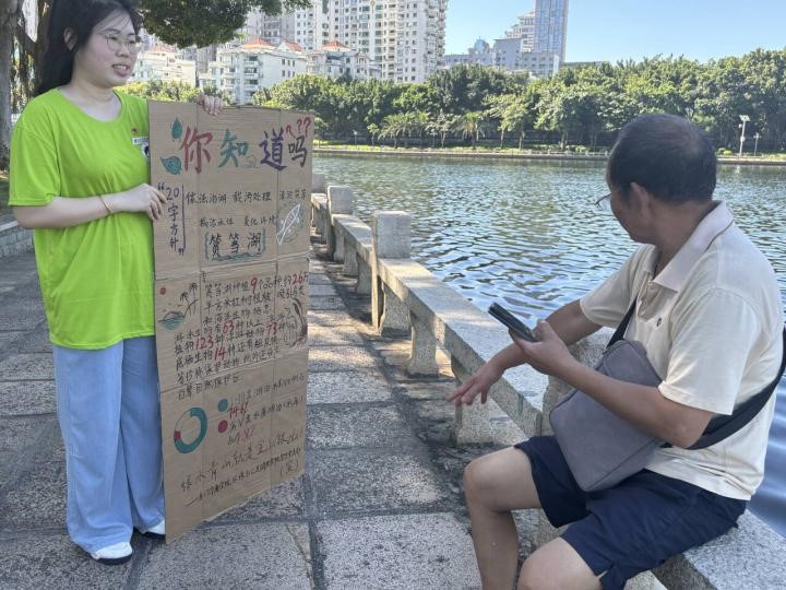成员们用手绘“筼筜,你知道吗”环保宣传板与筼筜湖附近的居民和游客进行交流,了解他们印象中的“筼筜”。通过采访,成员们了解到附近居民对筼筜湖的治理成果十分满意,纷纷为厦门市政府“一张蓝图干到底”的决心点赞。居民认为湖面情况的改善提高了他们的生活质量,也为他们的休闲活动提供了一个极佳的场所。