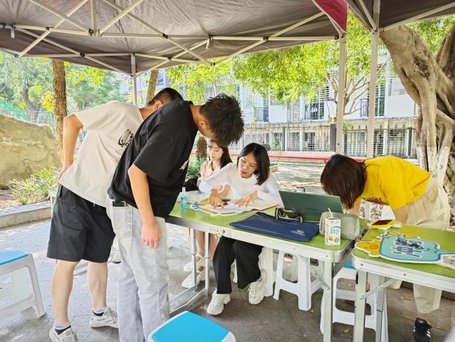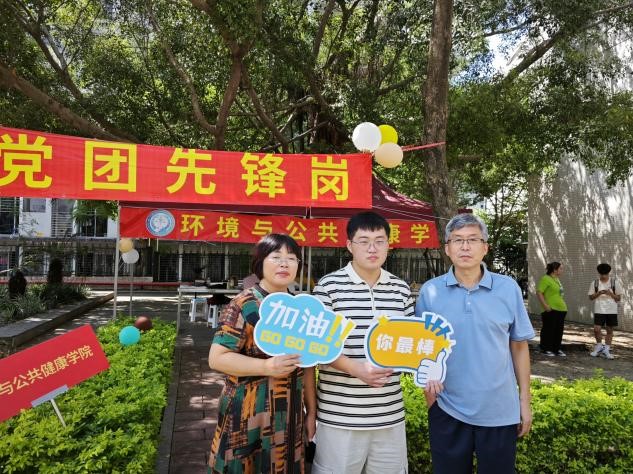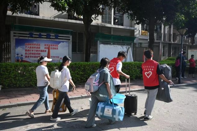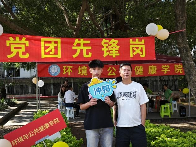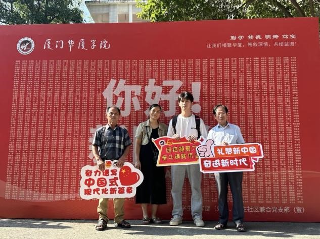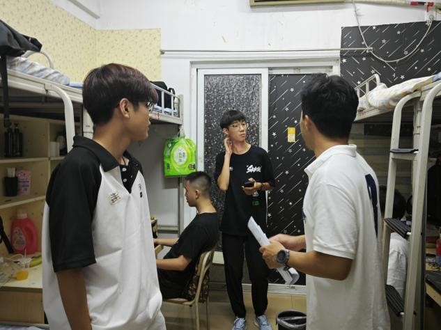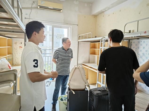 公司党总支书记林荣生与新生辅导员一同走访宿舍,在大本营与新生家长亲切交谈,关心新同学们的报到情况。