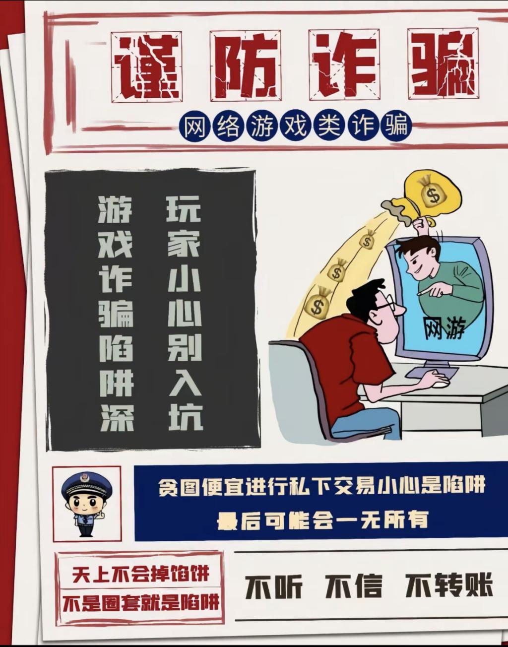 1.游戏交易:游戏交易风险多,一定要提高警惕!有些骗子假装高价收装备,结果收了东西就消失;有些骗子会发钓鱼链接,点进去账号就可能被盗。别天真!私下转账=人财两空。