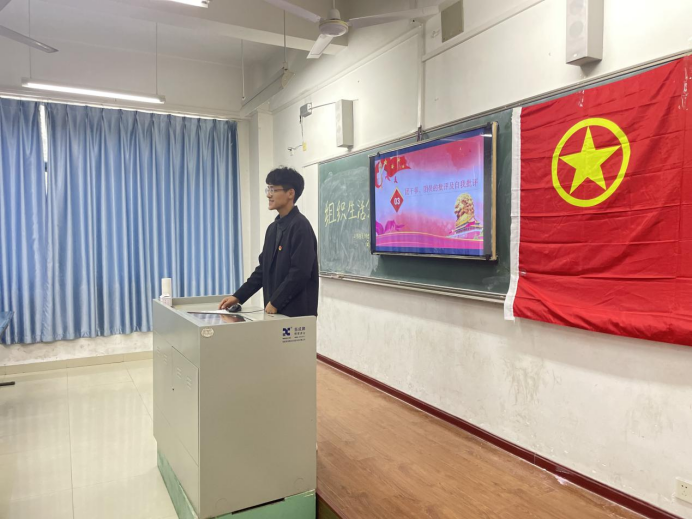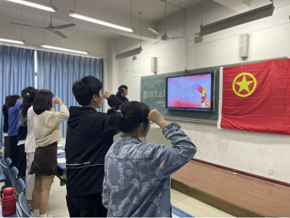 活动第六部分,此环节是由在座各位团员面向团旗握拳重温入团誓词。在各位团员们铿锵有力地宣誓声下,每一个人心中都充满着对中国共青团的崇敬之情。