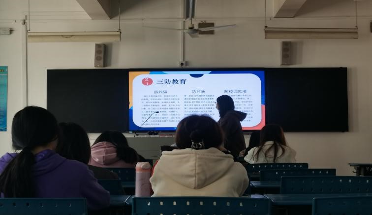 最后采用幻灯片的形式为同学们介绍了“三防教育”,即防诈骗,防邪教,防校园欺凌,力求为同学们提高日常生活的警惕性,擦亮眼睛。